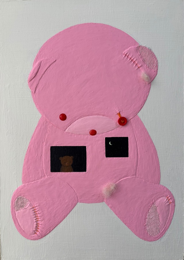 この度はご覧いただきありがとうございます。 2025年制作。 アクリル絵の具を使用し、 モデリングペーストを混ぜて、 表面に少し立体感のある表現を施しています。 大きなくまの体には窓があり、 その中に小さなくまが座っています。 外から見える姿と、 内側にひっそりと存在するもう一人の自分。 同じ形をしていても、 その在り方は少しずつ違います。 窓の中にいる小さなくまは、 普段は意識されにくい気持ちや、 言葉にならない感情を象徴しています。 覗くように見ることで、 見る人それぞれの「内側」を 重ねてもらえたら嬉しいです。 【作品情報】 2025年 182 × 257 mm アクリル、ボタン、糸、ガーゼ、羊毛フェルト、レジン、木製パネル coKUMADO. 「自分の中の自分」をテーマにした作品です。 【発送・作品の特性について】 発送までに10〜14日ほどお時間をいただいております。 ひとつひとつ丁寧に梱包し、お送りいたします。 ※状況により、発送までにお時間をいただく場合がございます。 ※キャンバス裏面には、制作過程による絵の具の付着がございますが、作品としての状態に問題はありません。 ※濃いお色の部分は、アクリル絵の具の特性により、制作過程や保管時の擦れなどで、白っぽく見える箇所がある場合があります。 素材と表現による風合いとしてお楽しみいただければ幸いです。